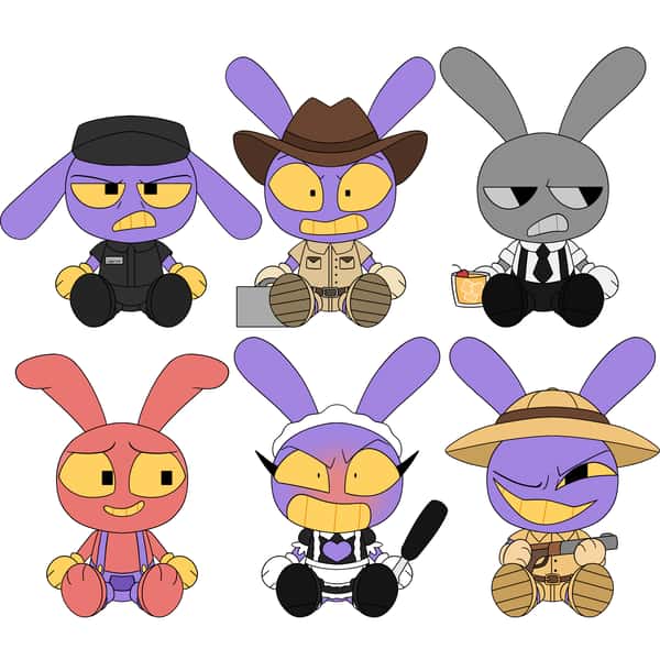Jax makes his debut as 5 6in plushies, along with evil jax making his debut as a 6in plushie. It's time to gamble with this mystery boxes that comes with 6 plushies, 5 of them being outfits jax wore throughout the show and one being a plushie of evil jax. Each plush would have wires in the ears making them posable. Test your luck and see who you can get