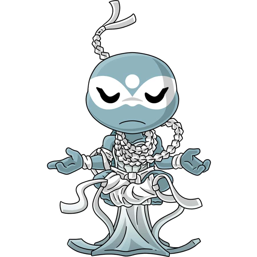 Venus floats calmly, harnessing her powers, now fully a turtle and a vision of her future self. The bright white and green color scheme adds to the mystic feeling she holds, as she floats above the floor, a gradient appearing on her dress to showcase her powers.