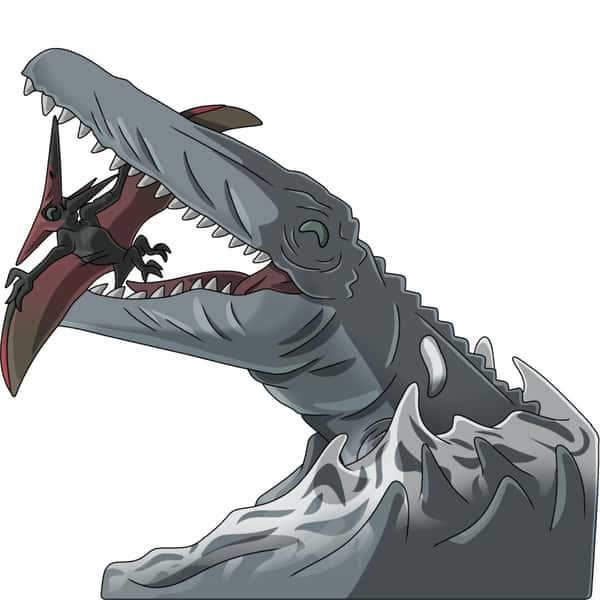 Hey, it's the big water creature from that attract-- oh no. It's uh, eating one of the bird thingies from the big dome. How did they get here? anywho, the big blue beast emerges from dark waters and captures a winged freak-a-nature in its jaws, threatening to pull it into the water and make a tasty meal outta it.