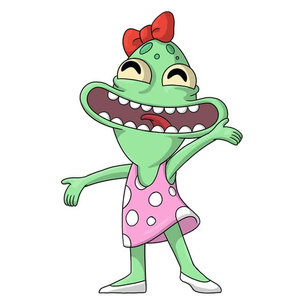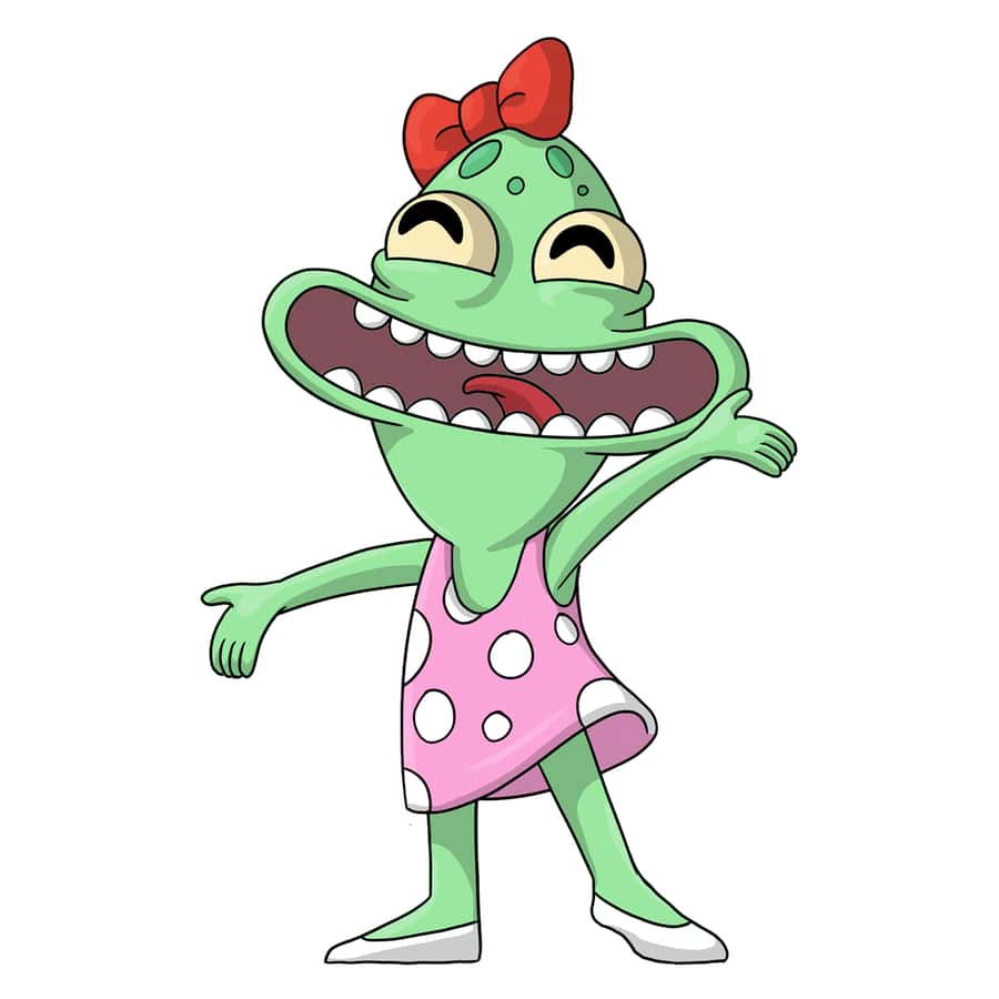 She’s just a regular teenage alien! Kind of… Throwing her arms out ecstatically as a huge smile full of round teeth stretches across her face and she looks upwards with a bright red bow on the top of her spotted head, she wears a pink and white polka-dot dress that flows around her waist along with white slip-on shoes.