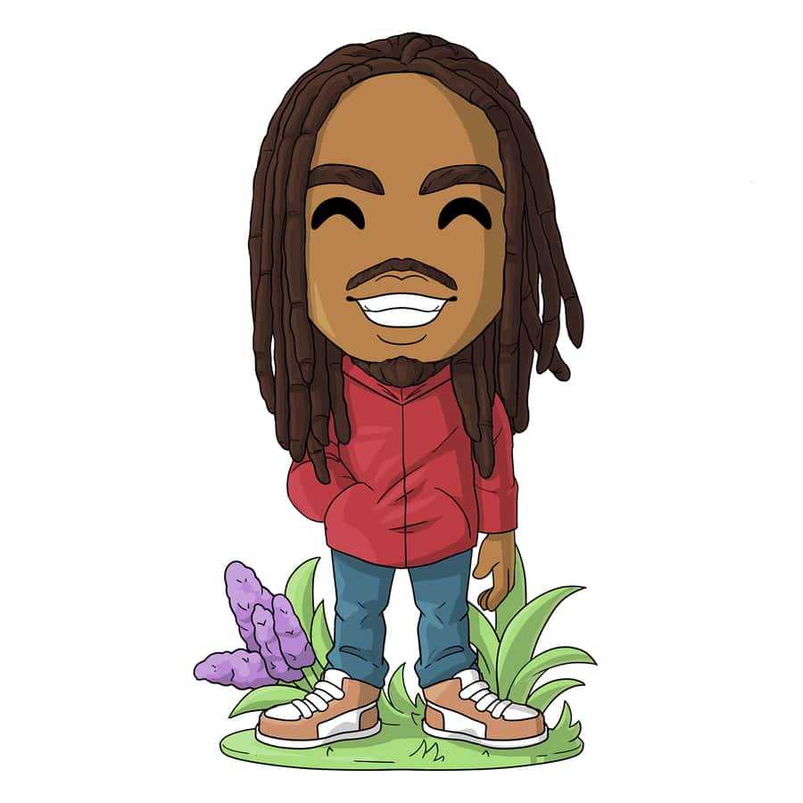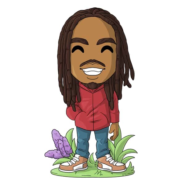 Live Laugh Love. Earl’s bringing some serious bars with a huge grin shining out from between dark facial hair and long dreadlocks framing his face, he stands with a hand in the pocket of his red jacket and wears blue jeans and two-tone caramel sneakers as long grass and flowers sprout out from behind his feet.