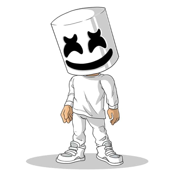 Turn it up! Marshmello’s taking the stage! Wearing his iconic marshmallow shaped helmet that has a huge smile curling under a pair of ‘X’ eyes, his fit matches its pristine white as he wears a long sleeve shirt, pants and high-top kicks.
