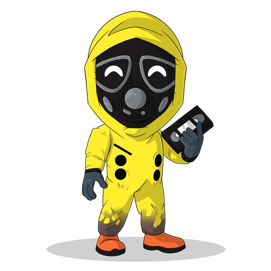 Is this room like the last room? And the last room? And the last room?! Wearing a bright yellow hazmat suit with the hood pulled over their head and a black gasmask with grey trimming covering their face, they hold a VHS tape in a gloved right hand as dirt stains their legs above orange boots.