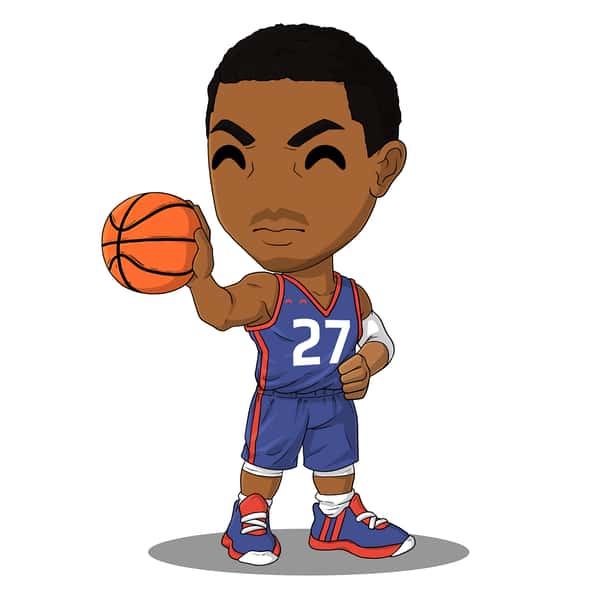 Now ain’t that the smoovest 3 pointer you’ve ever seen! With a left hand resting on his hip as the right holds an orange basketball out to the front, a serious look crosses his face as tight black hair covers his head and he wears a blue and red jersey that has ‘27’ printed on the front along with matching shorts and sneakers.