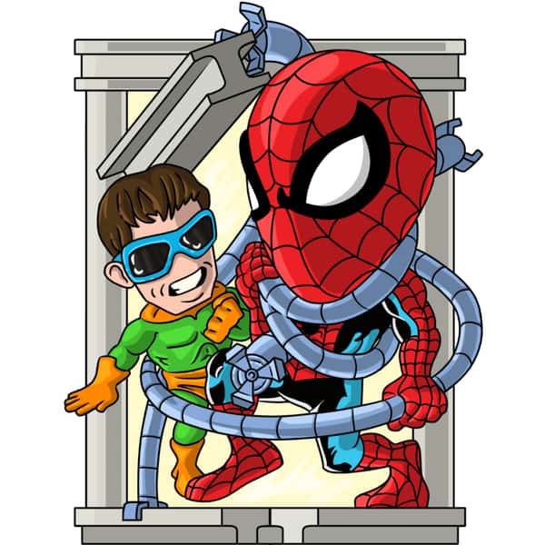 Fighting against the infamous Doc Ock, Spider-Man is seen wearing his iconic red and blue suit, with the black spider symbol barely visible on his chest. He struggles against a pair of Doc Ock’s metal robotic arms that wrap around his neck and torso. Doc Ock wears his green and orange spandex suit with a menacing grin on his face.