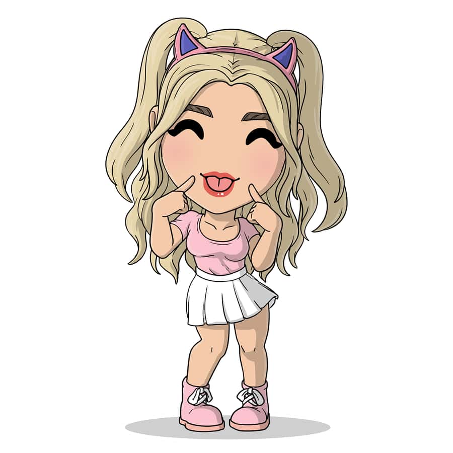 Get the squad together! We’re gonna have some fun! Sticking her tongue out as she points towards her blushing face while popping her hip to the side, a horned headband rests in front of a pair of long blonde ponytails as she wears a pleated white skirt, light pink top and matching boots.