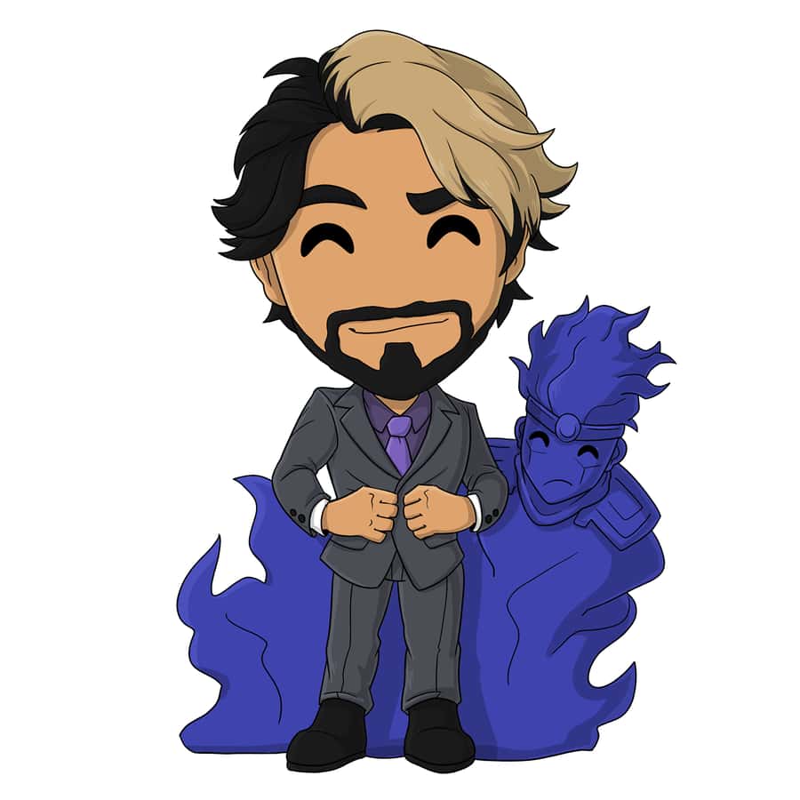 The Anime Man? More like the Youtooz Man! Holding the front of his black suit jacket that covers a deep purple shirt and tie, a thin smile peaks out from his dark beard as two-tone black and blonde hair sweeps across his head and his purple stand appears from behind him with an apathetic face.