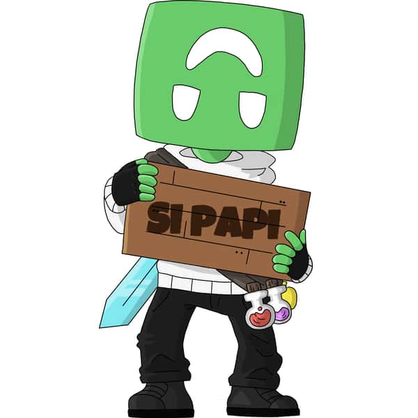 Boosfer debuts as a Youtooz figure! He is wearing a white hoodie and black pants, with a belt going across his body that holds 2 potions, a golden apple, and a sword on his back. He is holding up a sign with the text "Si Papi" written across it.