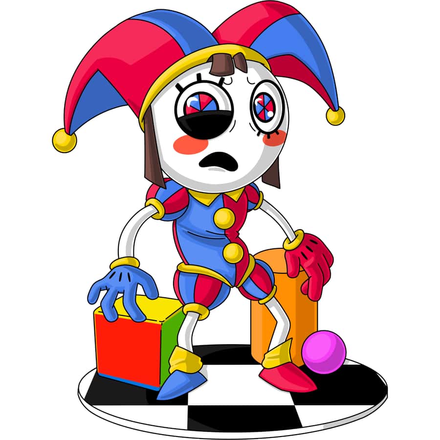 Welcome to The Amazing Digital Circus! Pomni has been frozen in place for this Youtooz figure design. Standing in a scared and confused pose on a base resembling the tiles floor of the circus, surrounded by all sorts of wacky geometry