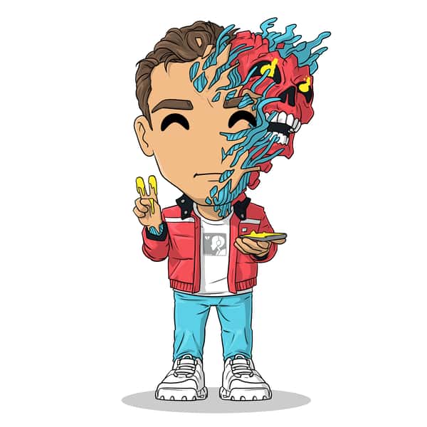 Logic’s here to drop a new banger! Raising the dripping yellow fingers of his right hand in a peace sign as he holds a phone in the other, a red skull with flaming yellow eyes explodes from his head in a mess of blue tendrils as he wears a puffy red jacket over a white t-shirt along with light blue jeans and white sneakers.