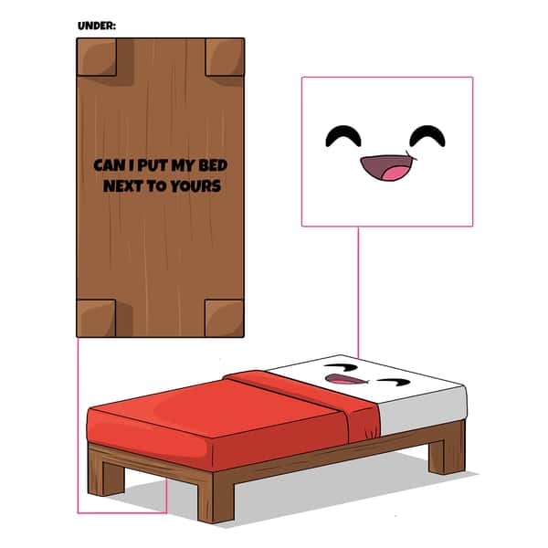 You can always put your bed next to mine ❤️ Propped up on a wooden frame with four legs as a red sheet is tucked over three quarters of their ‘body’, a cheery smile positively beams from their white mattress face.