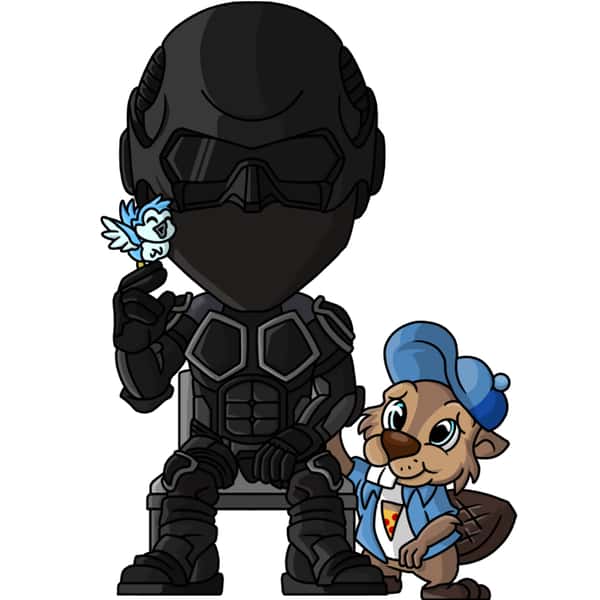 Black Noir sits calmly, fully equipped in his black armor, while a bird spreads its wings on his finger and Buster Beaver rests his arm against Noir’s side