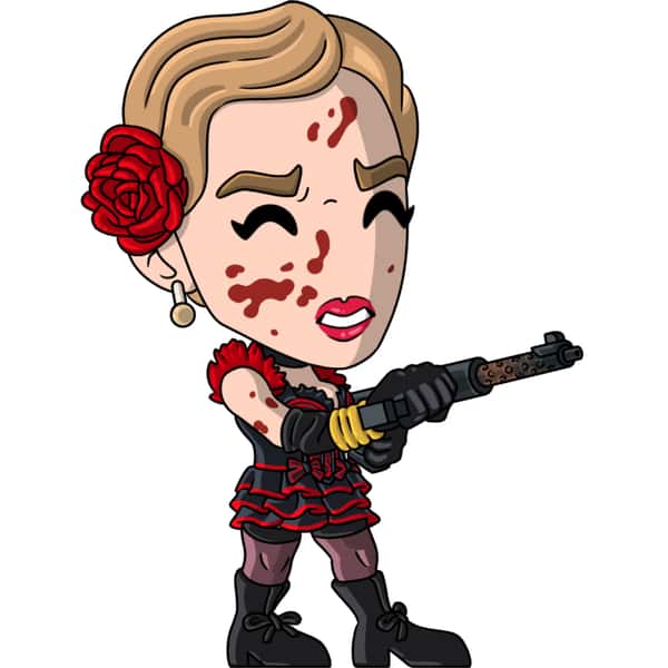 With a serious look on her face, Jessica Rose is seen holding a bootlegger and aiming at the enemies ahead. She wears a black and red dress, black boots and gloves, and a rose placed neatly in her hair.