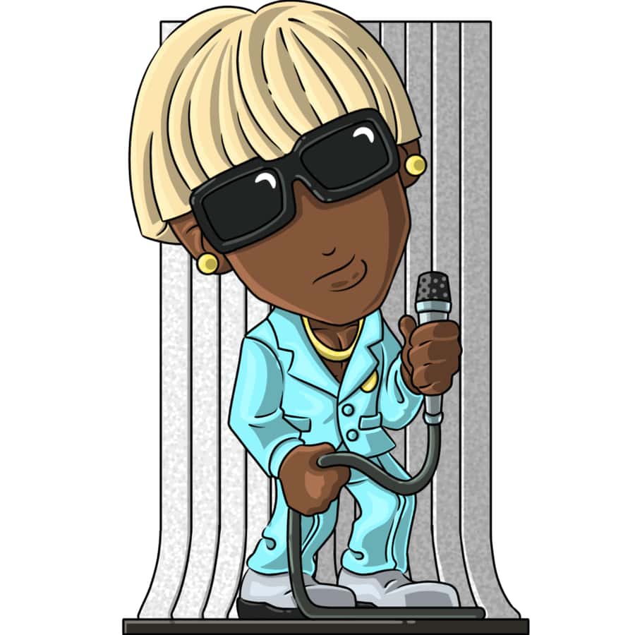 From the album Igor, Tyler, The Creator dances in front of a glittery backdrop while holding a microphone in one hand and its wire in the other. He wears a blonde wig, black shades, silver loafers, and a blue suit, revealing his chest underneath.