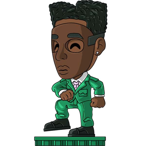 From the album Chromakopia, Tyler, The Creator is seen wearing a mask resembling his own face, a pink tie, and a deep green suit while marching on a green shipping container.