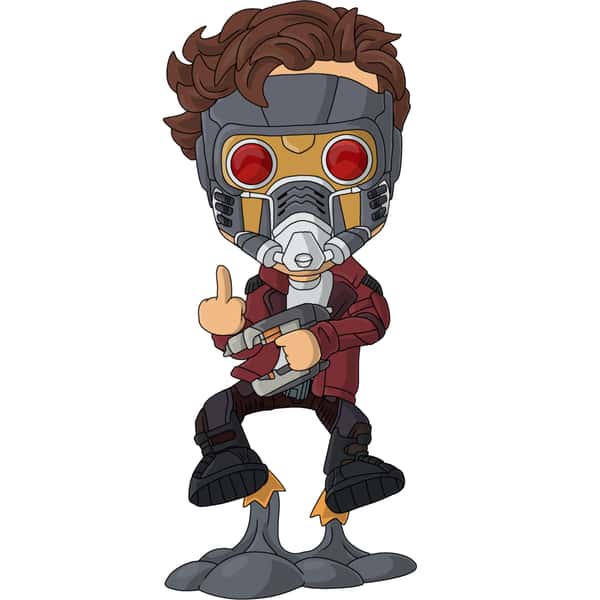 it’s the Star of the Show! get it? get it? it’s it’s because his name is- you get it. Quill’s launching himself in the air via his boots, holding up a blaster and flipping the bird to whoever he’s fighting right now. His mask covers his face while his hair is all messy and whatnot.