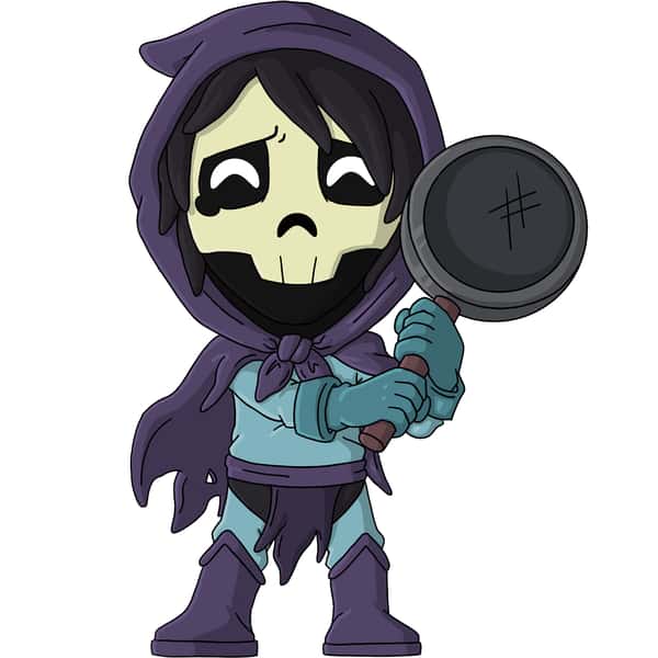 Missa has turned into a vinyl figure! He is wearing a mask, and his long black hair goes over his face, yet it cannot hide his worried expression. He is wearing a purple cloak, and is holding up a frying pan in a defensive position.