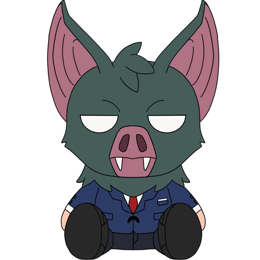Half man. Half bat. All freak. Sonar is now available in cuddle size! His head is that of a bat, with large ears, fangs, and empty white eyes. He is wearing a blue suit, and his hands are that of a human.