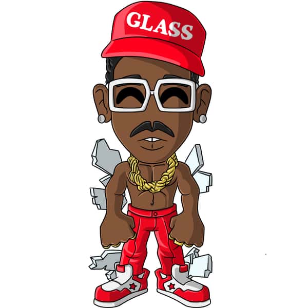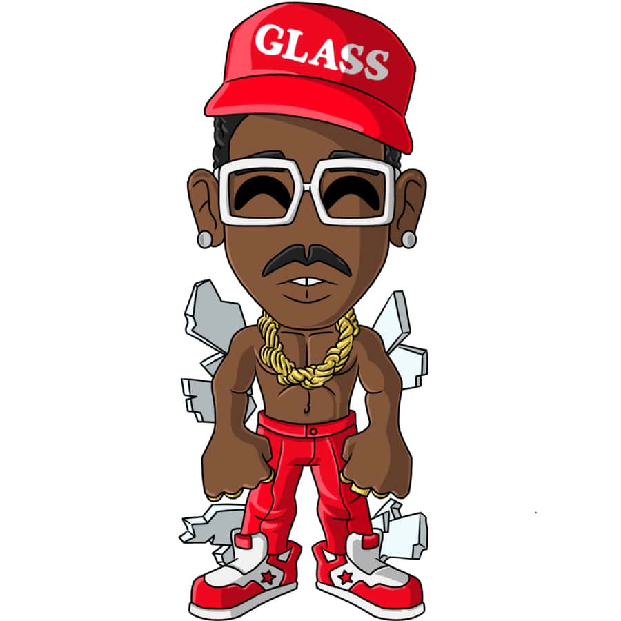 From the album Don't Tap The Glass, Tyler, the Creator stands firmly while glass shards appear behind him. He is dressed in red pants, a red hat that says “GLASS,” with a large gold chain around his neck.