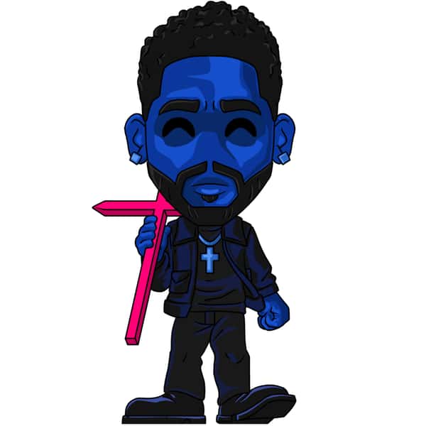 From the album Starboy, The Weeknd is seen walking with a big neon pink cross over his shoulder while wearing black pants, shoes, and a black leather jacket to top it off. Both his outfit and his face are illuminated by blue light.
