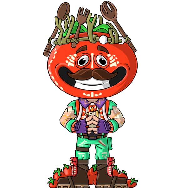 With a giant grin, Tomato Head wears a crown of utensils tied together by vines, which sits atop his giant tomato-shaped head. He holds a candle in front of his sleeveless outfit while a mountain of tomatoes surrounds his boots. His entire body features strange drawn-on patterns.
