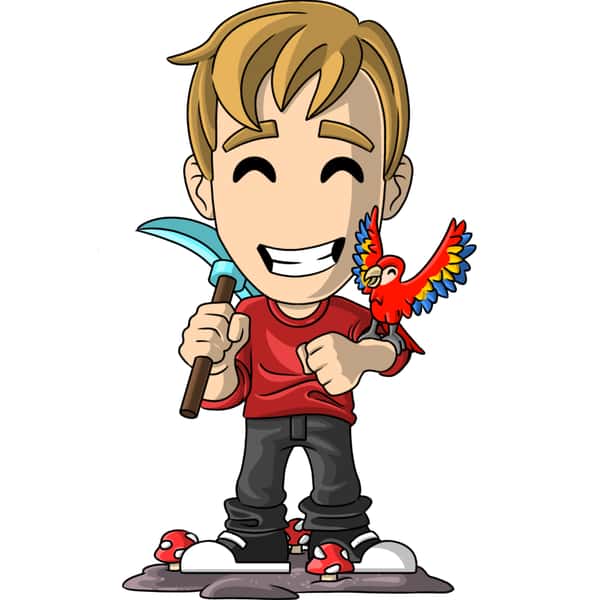 With a pickaxe over one shoulder and a red parrot resting on his other arm, Grian smiles contentedly. He wears a long-sleeve red shirt, dark grey pants, and black shoes while standing over mushroom-covered mycelium.