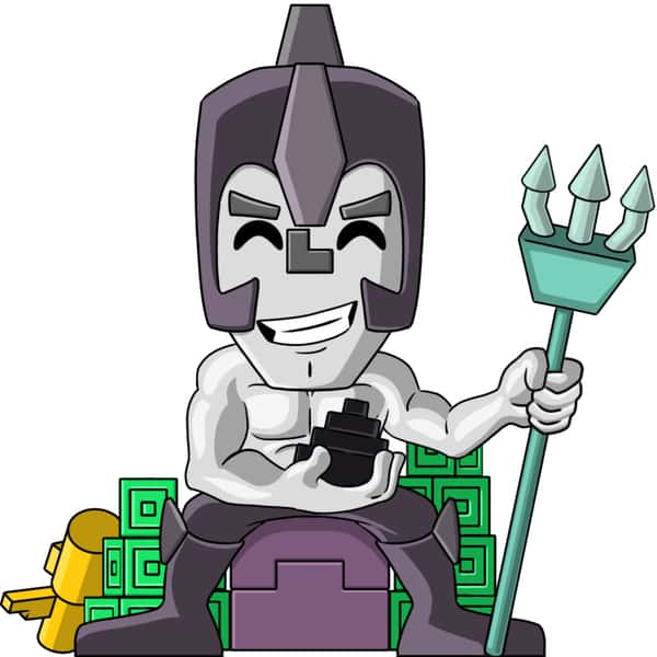 Luke TheNotable is seen sitting on a shulker, with a plethora of emerald blocks surrounding it, topped by a totem to his right. Luke wears netherite armor with his chestplate missing, revealing his muscular figure. He holds a dragon egg in his right hand and a trident in his left hand.