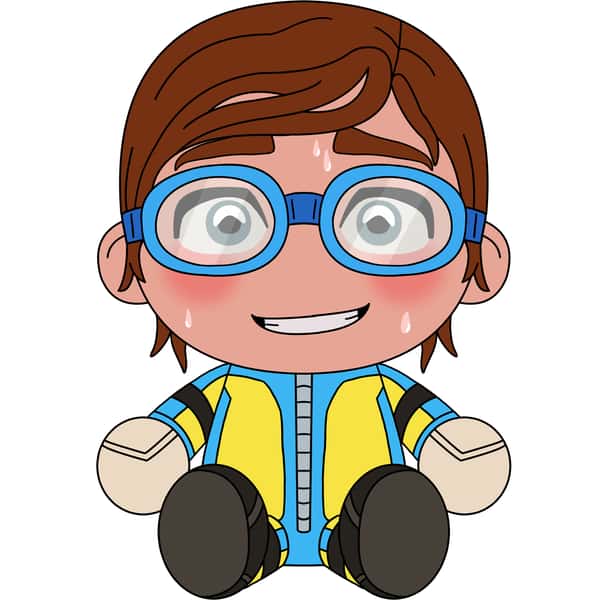 I am Moisture Man! Waterboy debuts in plush form, wearing his yellow and blue suit. He is wearing blue water goggles, and droplets of water stream down his face as he smiles nervously.