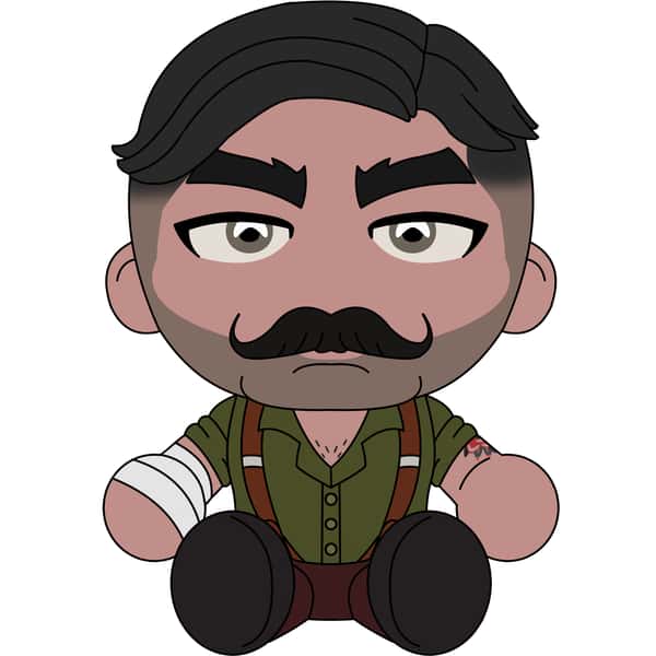 Top of the mornin! Punch Up debuts as a plush, wearing his green button-up shirt and brown suspenders. His mustaches is styled and trimmed nicely, and his hair is slicked to the side. One of his arms is bandaged, and the other features a tattoo.