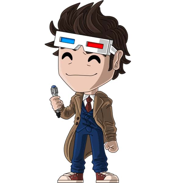 “Allons-y!” It’s the Doctor? who? it’s the one with the long tan coat covering a blue suit, tall messy hair slightly covered by 3d glasses above a big ol’ grin.. also holding up his sonic screwdriver.