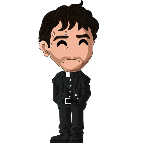 Hey! it’s that killer priest! Wearing an all black uniform, standing nervously with his hands in his pockets, sweat drops on his face and messy hair over his head.