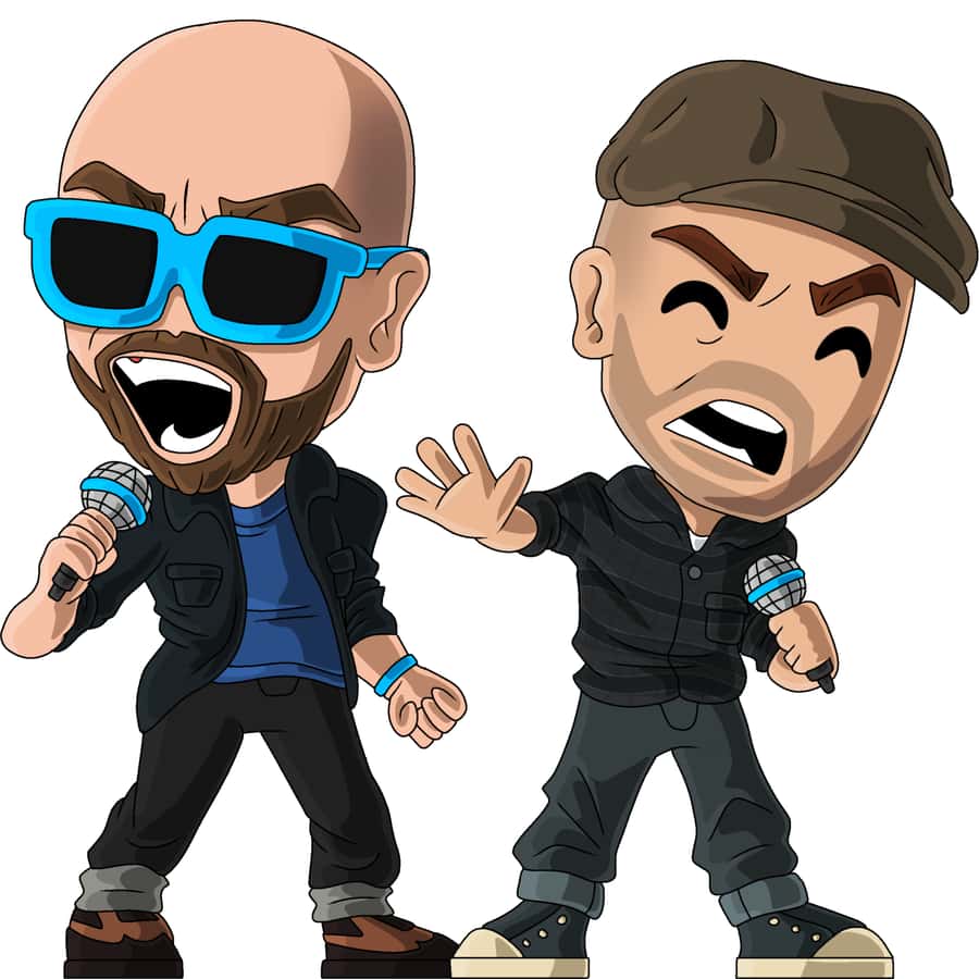 “EPIC RAP BATTLES OF HISTORRYYYY” It’s the ERB duo Nice Peter and EpicLLOYD! Standing side by side with microphones, yelling into them. Peter wearing blue sunglasses and a bracelet, while Lloyd wears a brown beret (?).