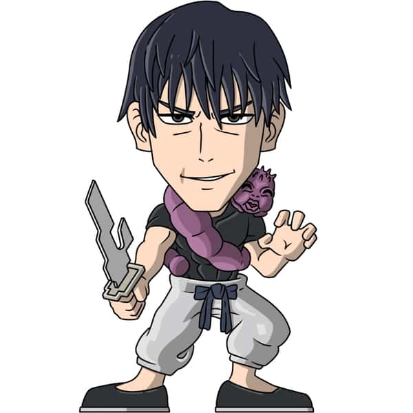 Wearing a tight-fitting black shirt, baggy pants, and slippers, Toji grips his dagger while standing defensively. A Cursed Spirit can also be seen wrapped around his body for his personal use.