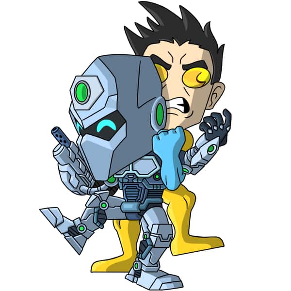 Armed with an arm cannon, Tech Jacket struggles against an Invincible variant wearing a yellow-and-blue spandex suit, yellow eye lenses, and an angry expression as he grips Tech Jacket. Tech Jacket is equipped with a full suit of sturdy gray armor.