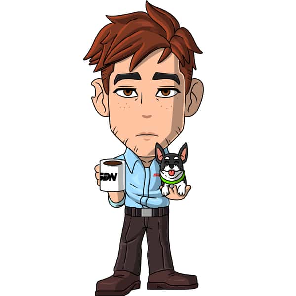 With an annoyed expression on his face, Robert is shown wearing a bright blue button-down shirt that’s tucked into his brown pants, which match his brown shoes. In his left arm, Robert carries Beef, who sticks his tongue out excitedly, and in his right hand, he holds a coffee mug branded with the SDN logo.