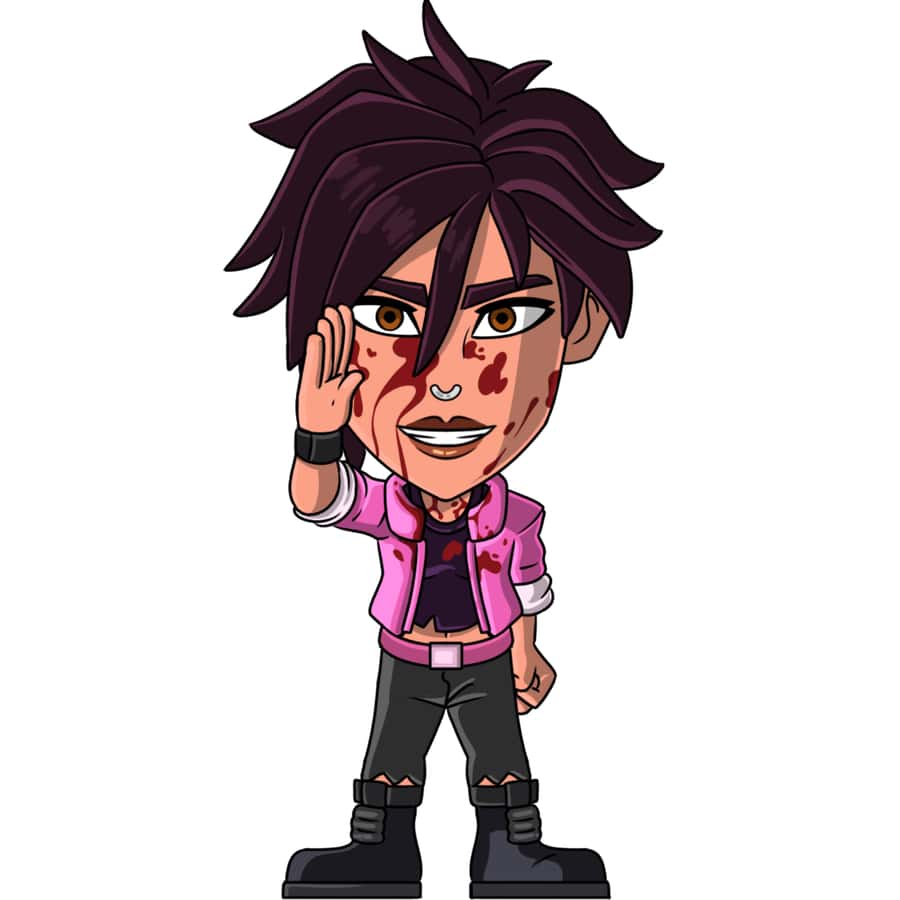 Saluting with a twisted grin, Invisigal wears a bright pink cropped jacket over a slightly torn dark purple shirt, gray ripped jeans, and black boots. She is also seen sporting a fresh layer of blood covering her face and upper body.