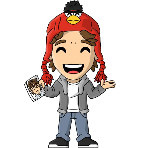 With an excited look, Grant is seen holding Mr. Robinson’s picture in his right hand while giving a shrugging pose with his left arm. He wears a red bird beanie over his messy brown hair, along with a gray jacket, blue jeans, and black shoes.