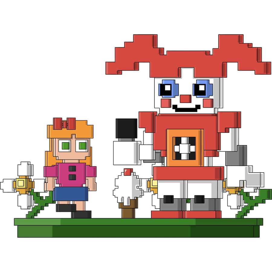Circus Baby hands out cupcakes on her way to Youtooz! She appears as an 8-Bit Vinyl Figure, inspired by her minigame in "Five Nights at Freddy's: Sister Location"! She stands idly, flowers surrounding her, and an ice cream cone in front of her, as Elizabeth Afton approaches.
