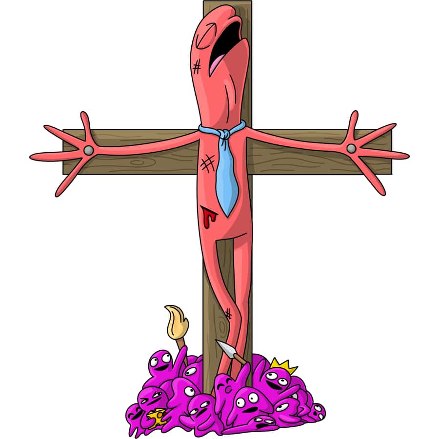 He just wanted his cheeeeeeeese! Allan from Smiling Friends nailed to a cross in a holy sacrifice surrounded by a hoard of bliblies attacking eachother and spreading chaos