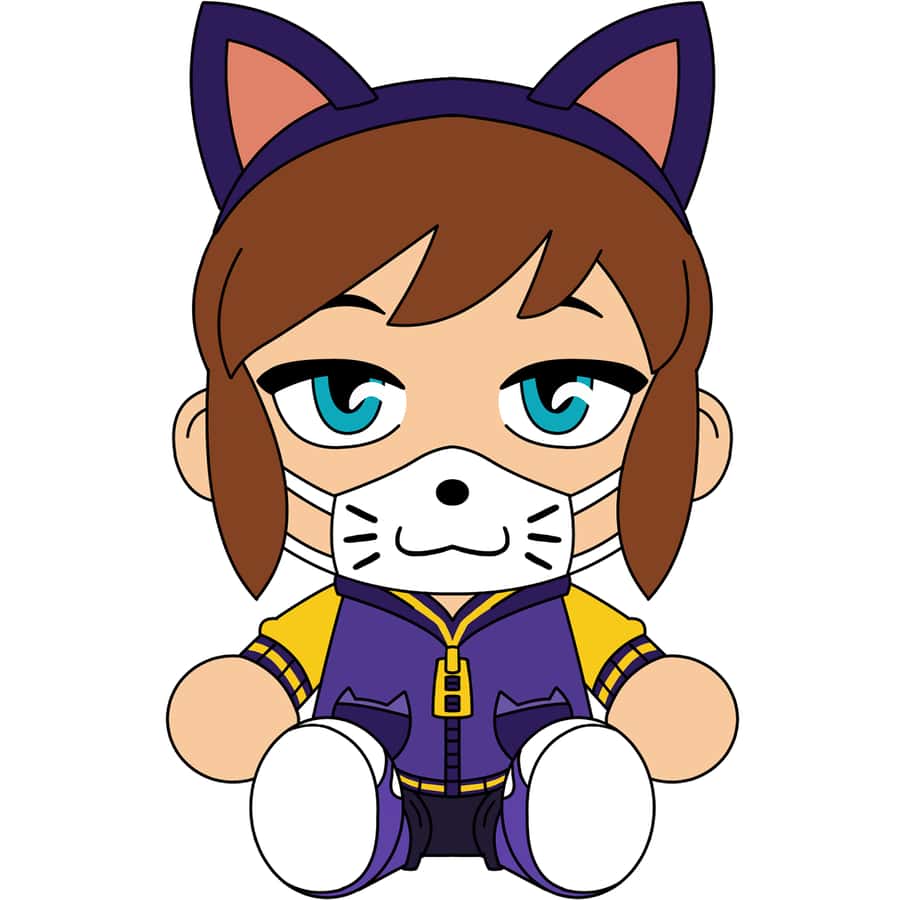 Hat Kid is back, but now with a new look. She is wearing her outfit from Nyakuza Metro, with a purple and yellow jacket, purple ears, and a white mask with a cat face printed on it. She has a mischevious face under the mask, ready to cause trouble!