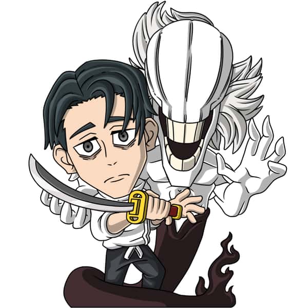 With a menacing look on his face, Yuta wields a sword gripped in his right hand while his left offers support. He wears white shoes beneath slim dark pants and a loose, high-collared white jacket that frames his disheveled black hair and dark eyes. Behind him, Rika stands behind him defensively, ready to attack.
