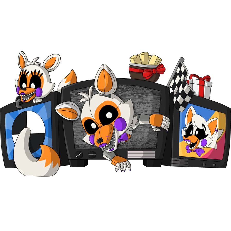 Lolbit makes their newest youtooz debut, but this time as a figure! The tv to the right depicts Lolbit from five laps at freddy's, accompanied by a checkered flag and present! The middle tv depicts Lolbit's main appearance, coming out of a static tv, with exotic butters on top, and the right one has a little fnaf world Lolbit laying on it!